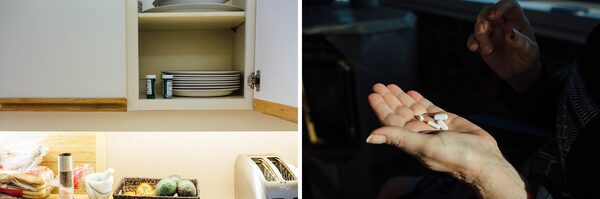 The Fergusons remind themselves which medications need to be taken with food by putting them with the plates. The elder Ms. Ferguson relies on her daughter to make sure she takes her medication at the right times.