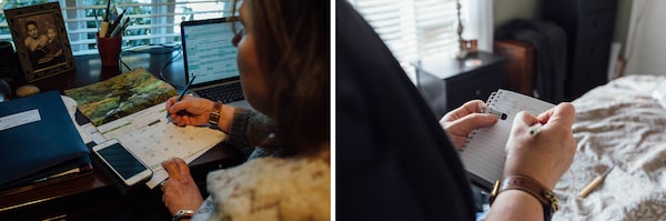 In a calendar, Sherri Ferguson keeps track of the many doctors' appointments her parents have to attend. In a notebook, she keeps records of her mother's insulin levels.