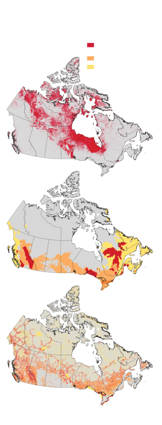 Some of the landscapes have been shaped by human presence for centuries, such the dikelands along the Bay of Fundy – tidal marshes converted to agricultural use that now face the threat of sea-level rise. In other areas, trade-offs between protection and production still lie in the future, such as in parts of the Northwest Territories, where climate change is setting the stage for a northern farming boom that could increase food security for the north but where the landscape currently plays a crucial role in carbon storage.