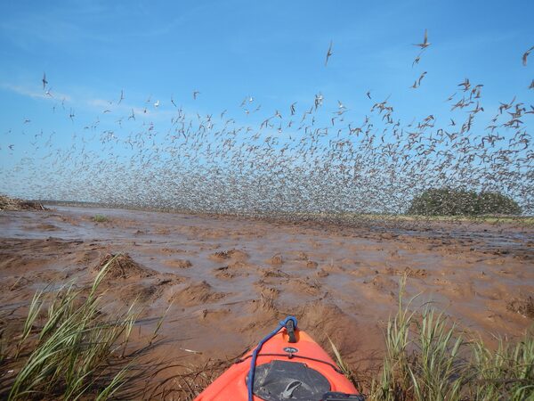 A flurry of semipalmated sandpipers, among other species, takes wing near the head of the Bay of Fundy, where a dike has been breached to allow the restoration of saltwater marshland, which serves to protect coastal infrastructure while providing habitat.Danika Van Proosdij/St. Mary's University