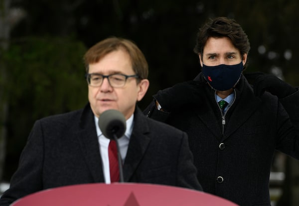 Prime Minister Justin Trudeau adjusts his mask as Minister of Environment and Climate Change Jonathan Wilkinson answers a reporter's question during an announcement on the government's updated climate change plan, in the Dominion Arboretum in Ottawa, on Friday, Dec. 11, 2020.Justin Tang/The Canadian Press