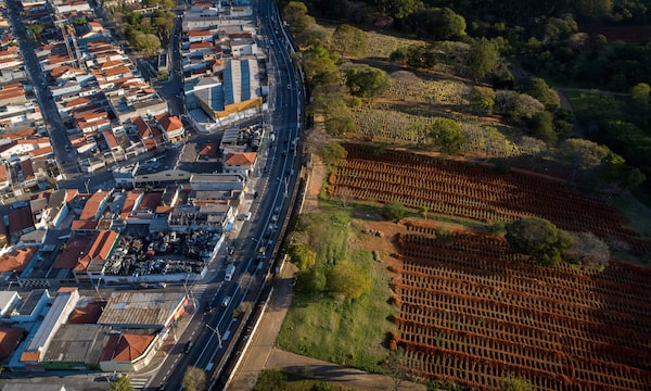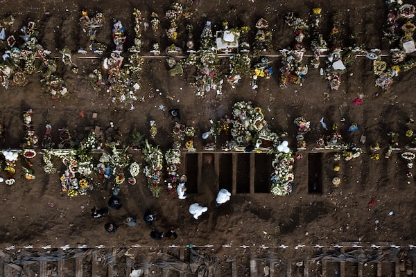 Freshly dug graves at the Vila Formosa Cemetery outside Sao Paulo, Brazil, on July 20 offer a glimpse of the scale of the coronavirus pandemic to date.AFP via Getty Images