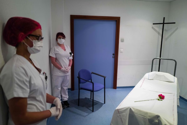 Mortuary workers at a hospital morgue in eastern France in April. Early detection of the COVID-19 threat could have helped countries prepare for the arrival of the virus in advance.SEBASTIEN BOZON/AFP/Getty Images