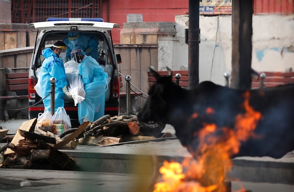 The body of a COVID-19 victim is prepared for cremation in New Delhi on June 5. Like elsewhere in the world, risks associated with the coronavirus pandemic have made honouring the dead in India a hurried affair, largely devoid of the rituals that give it meaning for mourners.Manish Swarup/The Associated Press
