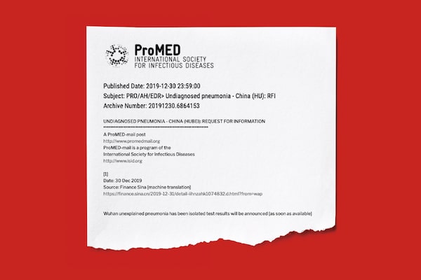 An alert sent by ProMed on Dec. 30 was the first international alert of the novel coronavirus outbreak. (Click to enlarge)PHOTO ILLUSTRATION: THE GLOBE AND MAIL