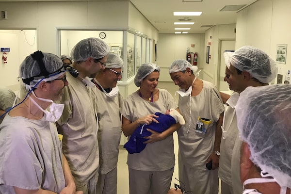 The medical team at the Hospital das Clinicas holding the first baby to be born following a uterus transplant from a deceased donor.Divulgação Hospital das Clínicas da FMUSP.