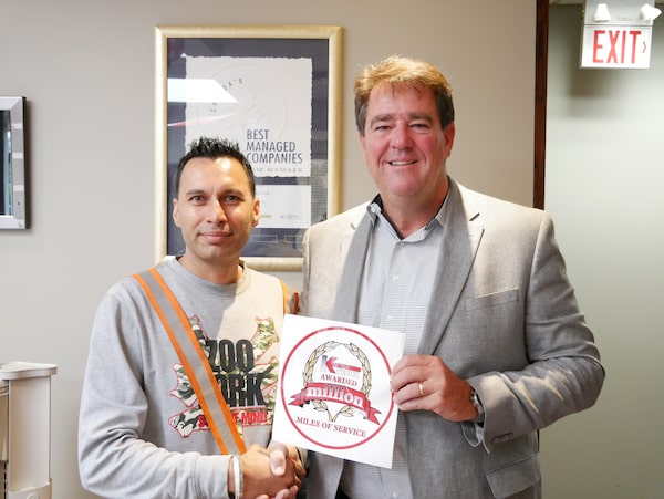 Mark Seymour, CEO of Prescott, Ont.-based Kriska Transportation Group Ltd., presents an award to driver Malkit Shergil. The company has found some success reaching out to retired military personnel and introducing a truck sharing program for long-haul drivers.