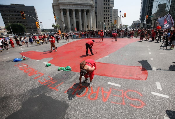 Family and supporters paint a red dress as they gather to protest a lack of action by all levels of governments in funding a search of Winnipeg's landfills for missing Indigenous women, at Portage and Main in Winnipeg, on Aug. 3, 2023.JOHN WOODS/The Canadian Press