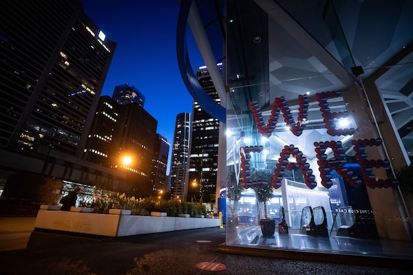Paper hearts spell out 'we care' on a BMO branch in downtown Vancouver.Darryl Dyck/The Canadian Press/The Canadian Press