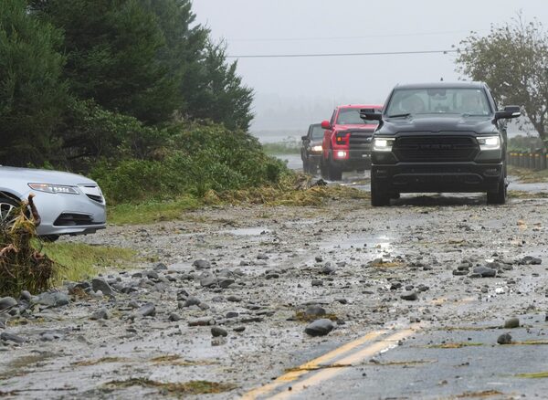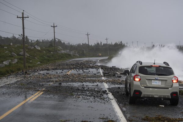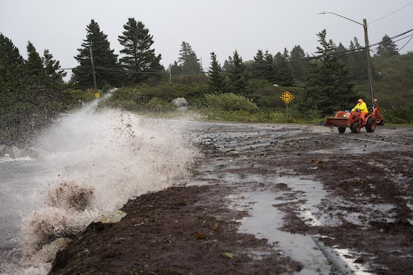 A vehicle navigates around debris after the arrival of Post Tropical Storm Lee in Lockeport, N.S., on Sept. 16, 2023.JOHN MORRIS/Reuters