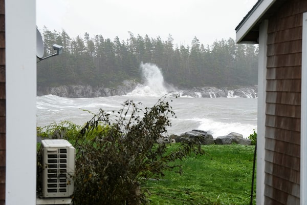Waves crash ashore as a person works on his house after the arrival of post-tropical storm Lee in Lockeport, N.S. on Sept. 16, 2023JOHN MORRIS/Reuters