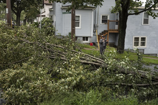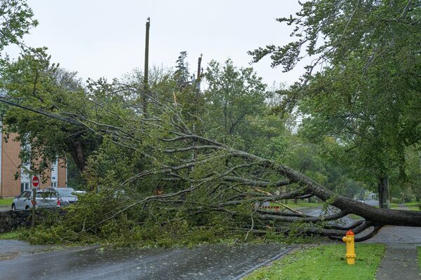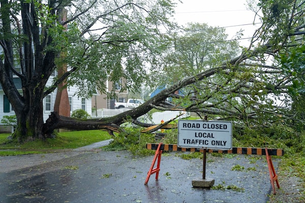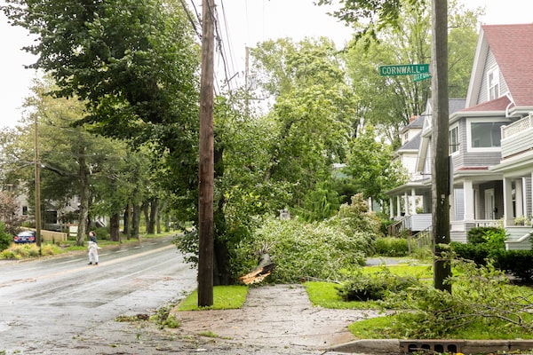 Fallen trees are pictured in a Saint John, N.B. neighbourhood as post-tropical storm Lee moves through the Maritimes on Sept. 16, 2023.CHRIS DONOVAN/Reuters