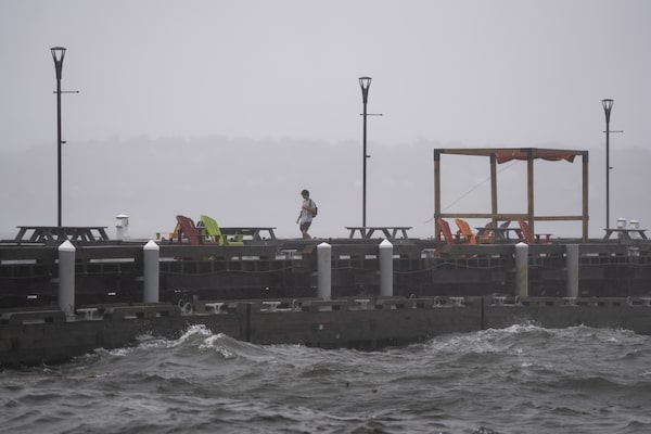 A pedestrian walks along the waterfront in Halifax as post-tropical cyclone Lee causes intense wind and heavy rain throughout the region Sept. 16, 2023.Darren Calabrese/The Globe and Mail