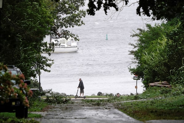 A person on a scooter navigates downed branches caused by post-tropical storm Lee in Shelburne, N.S., on Sept. 16, 2023.JOHN MORRIS/Reuters