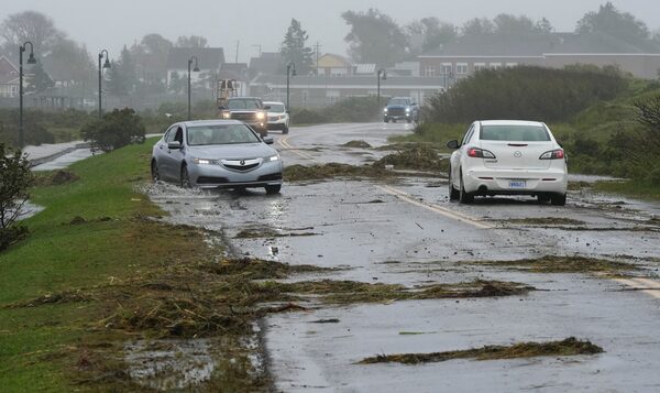 Vehicles navigate a flooded road after post-tropical storm Lee began to bear down on Lockeport, N.S. on Sept. 16, 2023.JOHN MORRIS/Reuters
