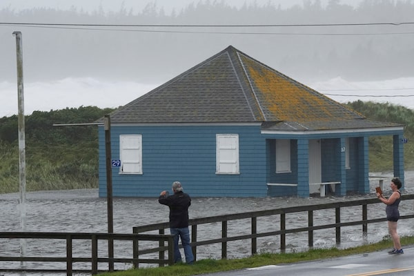 People take photographs of the flood waters in Lockeport, N.S., after Hurricane Lee was downgraded to a post-tropical storm, on Sept. 16, 2023.JOHN MORRIS/Reuters