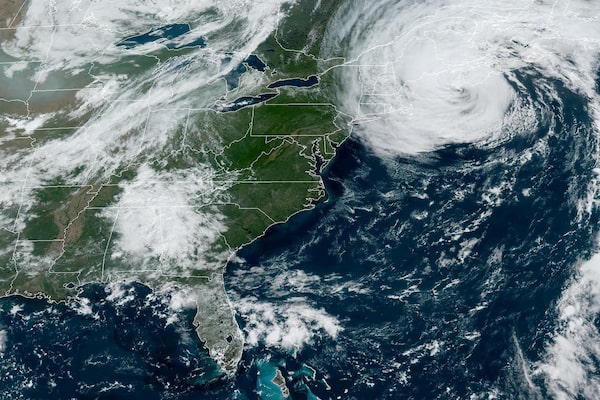Post-tropical storm Lee approaches landfall in the Canadian Maritimes in a satellite image from the National Oceanic and Atmospheric Administration on Sept. 16, 2023.NOAA/Reuters