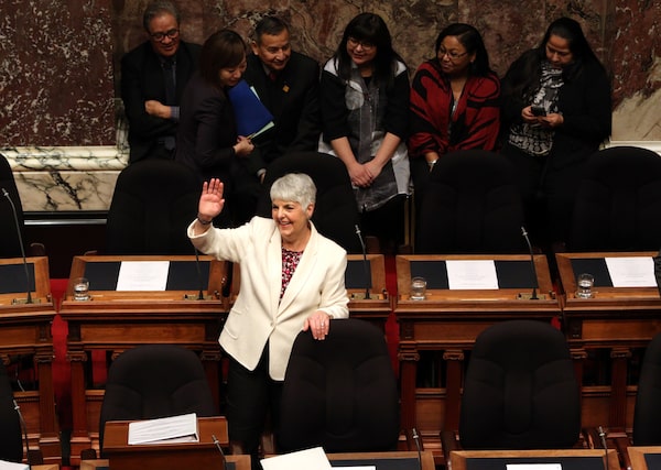 Finance Minister Carole James arrives to deliver the budget speech as she waves to people in the gallery at the legislature in Victoria, B.C., on Feb. 19, 2018.CHAD HIPOLITO/The Canadian Press