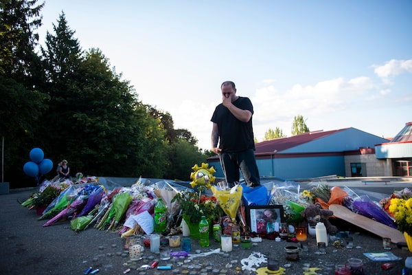 Aron Crimeni reacts to flowers for his son, Carson, near the spot where he died of an overdose in Langley August 13, 2019.Jimmy Jeong/The Globe and Mail