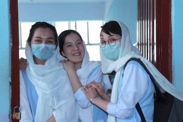 Ms. Musleh is in the middle of two friends, Bahara and Fatima, at Marefat High School in Kabul.Courtesy of Marina Musleh