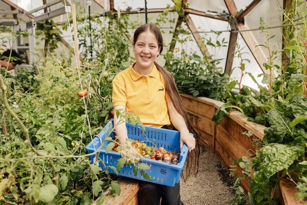 Ms. Musleh picks ripe tomatoes in the growing dome at Shawnigan Lake School.