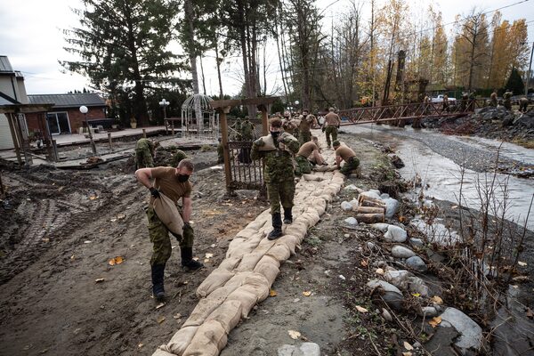 Members of the Canadian Forces build a temporary dike on Nov. 24 with sandbags in Abbotsford, B.C.DARRYL DYCK/The Canadian Press