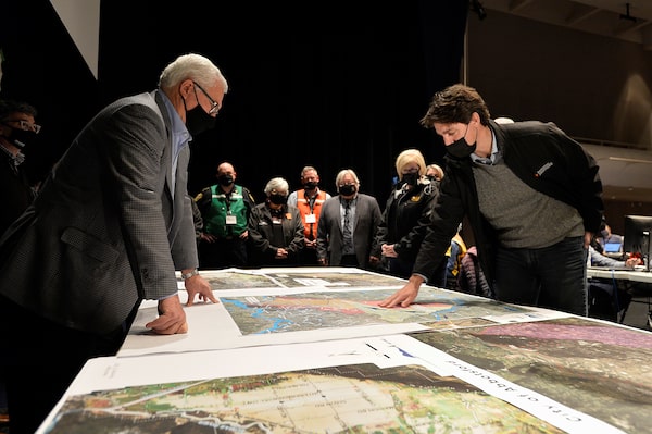 Prime Minister Justin Trudeau is shown maps by Abbottsford Mayor Henry Braun during a visit to the city after rainstorms lashed the western Canadian province of British Columbia, triggering landslides and floods, and shutting highways, in Abbotsford, B.C.JENNIFER GAUTHIER/Reuters