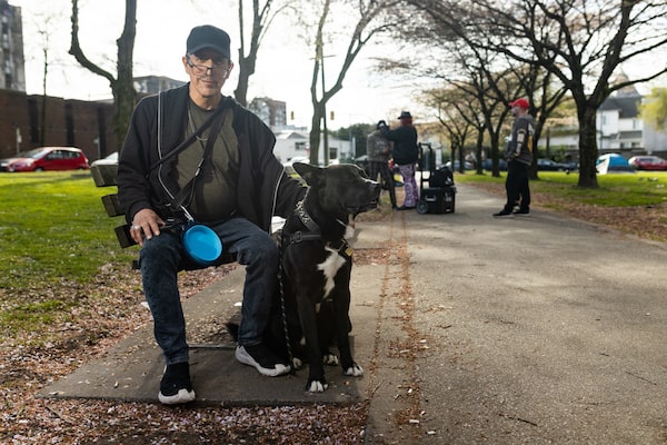 Wayne Boucher with his dog Chewy in Vancouver’s Oppenheimer Park on Wednesday. Mr. Boucher says Vancouver police told him in February he can no longer shelter outdoors within two kilometres of BC Place stadium due to new bylaws mandated for the FIFA World Cup.Jesse Winter/The Globe and Mail