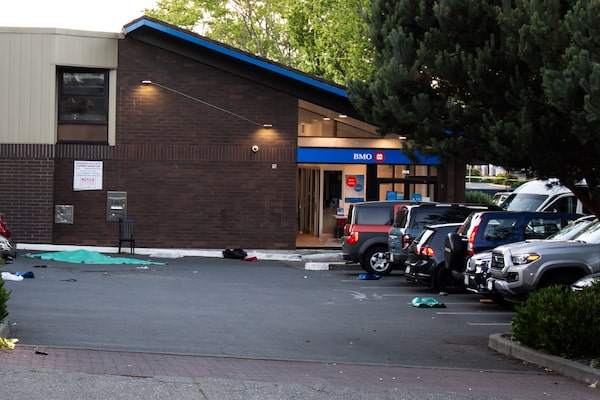 BMO parking lot, in front of the green tarp, you can see the bloodstains where the robbers fell, in Saanich, B.C., on June 29.Nancy Macdonald/The Globe and Mail