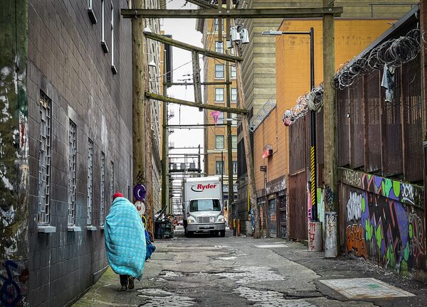 A person wrapped in a blanket walks through a Downtwon Eastside alley on Feb. 10, 2021.DARRYL DYCK/The Globe and Mail