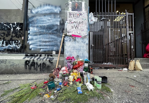 A memorial for a person named Karen W. lays outside a building in the Downtown Eastside of Vancouver on Feb. 10, 2021.DARRYL DYCK/The Globe and Mail