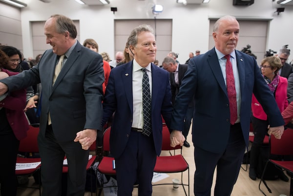 B.C. Minister of Environment and Climate Change Strategy George Heyman, centre, joins hands with Green Party Leader Andrew Weaver, left, and Premier John Horgan during a First Nations blessing before the provincial government released its CleanBC plan aimed at reducing climate pollution, in Vancouver on Dec. 5, 2018.DARRYL DYCK/The Canadian Press