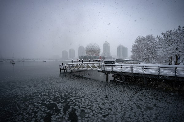 A person looks out to a partially frozen False Creek during a snowstorm in Vancouver on Jan. 17.ETHAN CAIRNS/The Canadian Press
