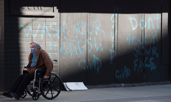 A man wearing a protective face mask wheels his wheelchair past a spray painted wall saying 'Wash your hands and don't touch your face' in downtown Vancouver, March 18, 2020.JONATHAN HAYWARD/The Canadian Press