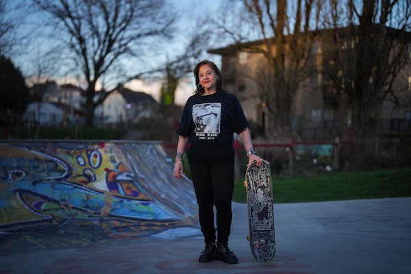 Meredith Dan holds her late son Glenn Rebic's skateboard at the China Creek skate park where he used to skateboard in Vancouver on March 13.DARRYL DYCK/The Canadian Press