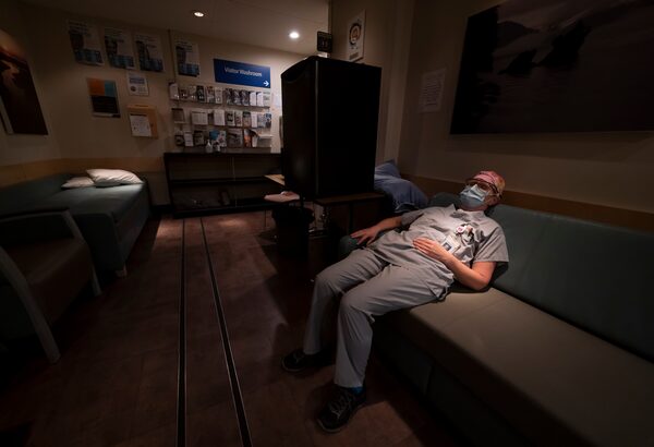 Intensive care unit nurse Sophie Gabiniewicz rests in one of the staff rooms during her shift at St. Paul's Hospital in downtown Vancouver, Friday, on Dec. 4, 2020.JONATHAN HAYWARD/The Canadian Press