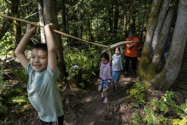 Paulina Taekema, Indigenous culture student support worker, rear, helps grade 1 and kindergarten students with carrying a cedar strip near Qwam Qwum Stuwixwulh School in Nanaimo, B.C. on May 18.Rafal Gerszak/The Globe and Mail