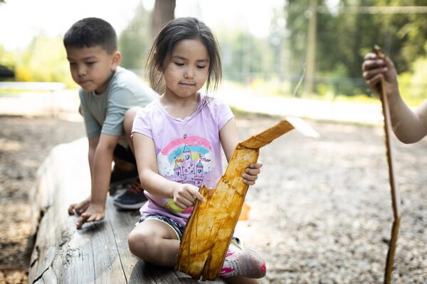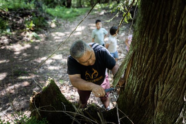 With a machete, George Seymour carved a series of lines near the base of an old cedar tree, then pried up a section of bark. With a strong tug, a narrow strip peeled away. His primary school students exclaimed with delight as the four-metre-long section landed on the ground.