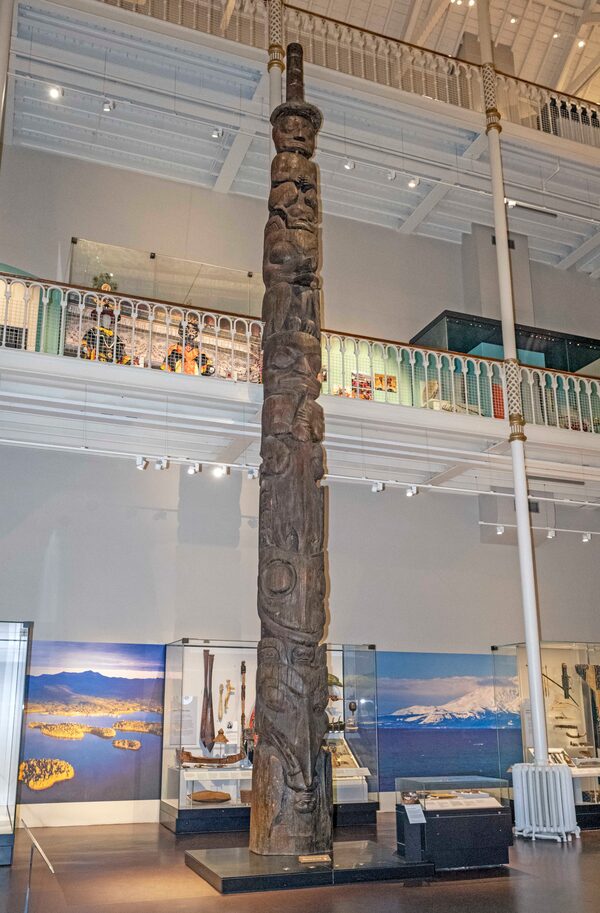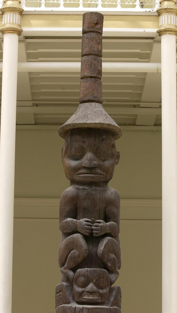 Its current plaque is short on information and context. And the pole is installed among artifacts from other First Nations. “From the North American arctic to the deserts of Australia, the peoples in this gallery lead contemporary lives, but their traditional values are based on a deep connection to the land,” the entrance plaque to the gallery reads, in part.