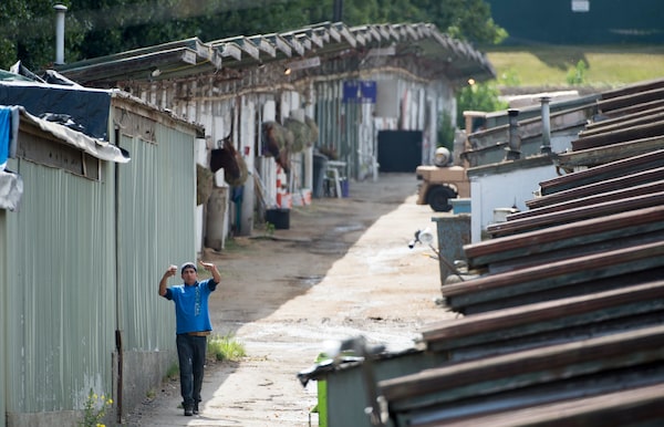 A man is seen among the stables behind Hastings Racecourse in Vancouver, on Tuesday, Aug., 20, 2019.JONATHAN HAYWARD/The Canadian Press