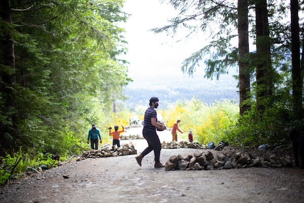 Protesters work to construct road blocks along a logging road at the Fairy Creek blockades headquarters.