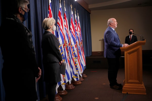 Premier John Horgan speaks about Phase 2 in B.C.'s COVID-19 immunization plan as Dr. Penny Ballem, far left, Dr. Bonnie Henry and Minister Adrian Dix look on during a press conference at Legislature in Victoria, B.C., on March 1, 2021.CHAD HIPOLITO/The Canadian Press