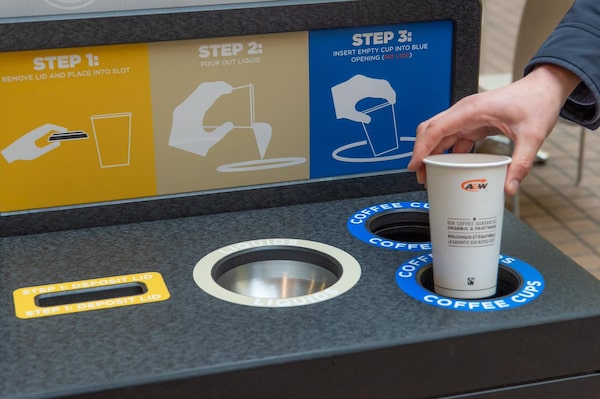 The initiative includes equipping five downtown Vancouver locations with customized bins that clearly explain how the cup, the lid and any leftover liquid should be discarded. The instructions are meant to be easy to follow.