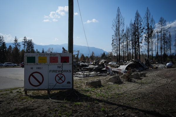 A sign warning of the level of fire danger in front of the burned remains of the Scotch Creek – Lee Creek fire department and community hall, in Scotch Creek, B.C., on Sept. 6.DARRYL DYCK/The Canadian Press