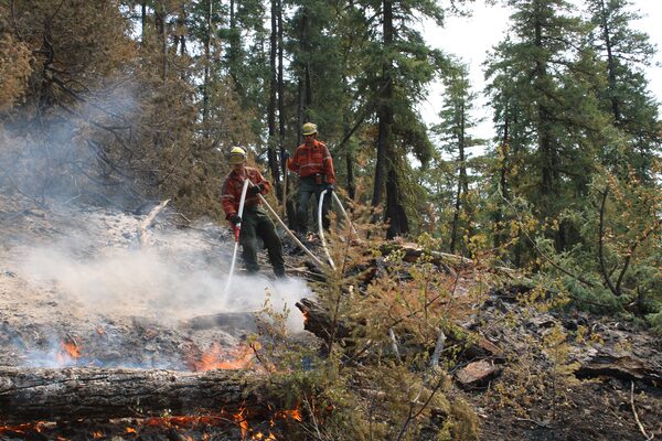 Wildland firefighters with the B.C. Wildfire Service perform mop-up operations on the Shetland Creek wildfire's eastern flank in the area of Thompson-Nicola, B.C., on Aug. 8, 2024.HO/The Canadian Press