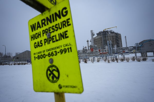A gas pipeline warning sign outside FortisBC's Tilbury LNG facility, in Delta, B.C., on Dec. 19, 2022.DARRYL DYCK/The Globe and Mail