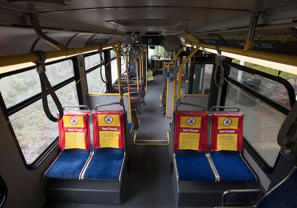 Seats are marked closed for physical distancing on a public transit bus in North Vancouver on May 12.Jonathan Hayward/The Canadian Press/The Canadian Press