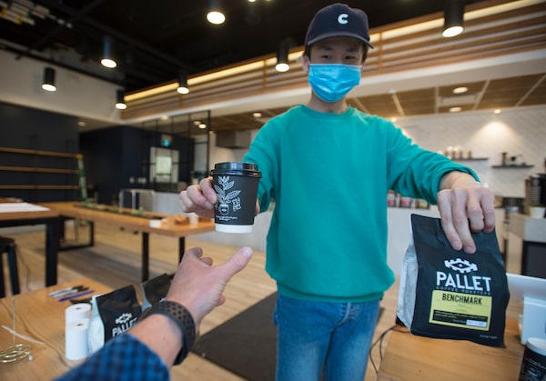 A Vancouver server passes coffee to a customer on May 20, when B.C.'s Phase 2 allowed more businesses to reopen.Jonathan Hayward/The Canadian Press/The Canadian Press