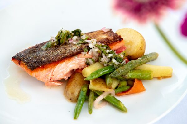 Pan-seared salmon with summer vegetable salad, pickles and chimichurri.