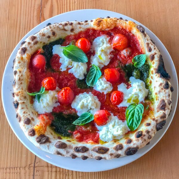 Margherita pizza with pesto, olive-oil poached tomatoes and house-made stracciatella from the wood-fired oven at Buono Osteria.